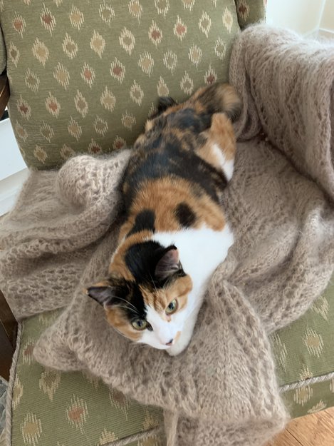 HiN har et orange lår med striper, og et svart lår. Hun har litt klippet pels på sidene på bakre halvdel etter en operasjon. Hun er liten og spe - petit!