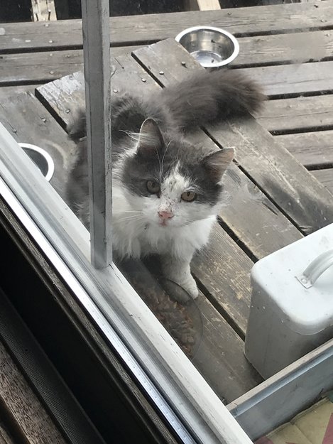 Kommer hyppig til oss å spiser. Er skvetten og masse arr i ansiktet og pelsen er i store baller på ryggen