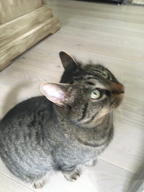 Stor pus, litt rødlig i ansiktet. Ellers svart og gråtigret