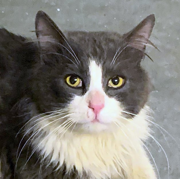 Langhåret, grå og hvit tuxedo. Hvitt bless og over kinnene og ned. Hvite, stor poter. Gule øyne. Store poter (ikke skipskatt).