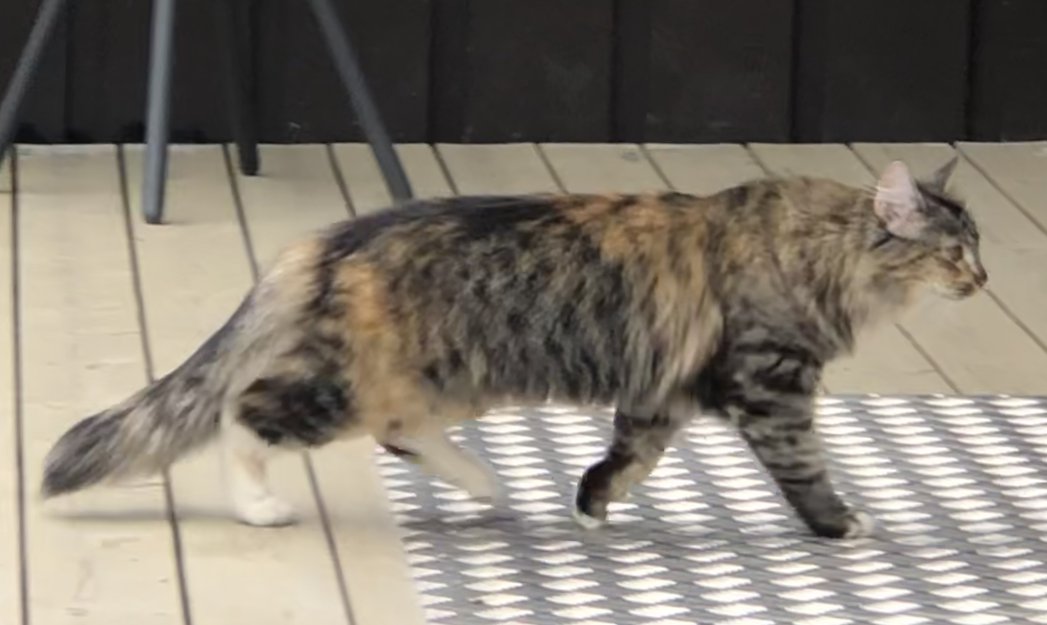 Tenkte først det var en nyinnflyttet katt i nabolaget, men den er i hagen min tilsynelatende det meste av døgnet. Virker skvetten ved brå bevegelser, som om den er vant til å bli jaget. Samtidig rolig og vant til mennesker. Dette er neppe en gammel katt, den virker våken og nysgjerrig, men får samtidig en følelse av at den ikke er dreven mht å leve det «frie liv». Pen og sympatisk. Nylig stukket hjemmefra?