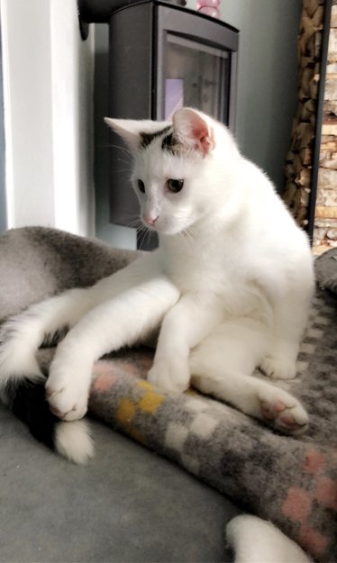 Vit hankatt, svart i pannan och på halen. Hannkatt, kastrert og ID-merket.