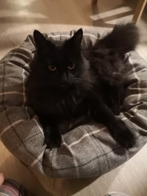 Sort, langhåret katt med gule øyne. Litt lysere underpels men ganske helsort. Spisse rette ører. Han er glad i folk, og kjempesnill. Veldig nysgjerrig, kan godt finne på å gå inn i en garasje eller en bod.