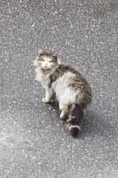 Utrolig sky, langhåret katt. Ser utrolig skitten ut, har nok vært ute lenge.