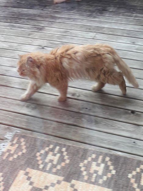 Katten er tynn og pelsen er tovete. Han har et skadet øye og virker sky.