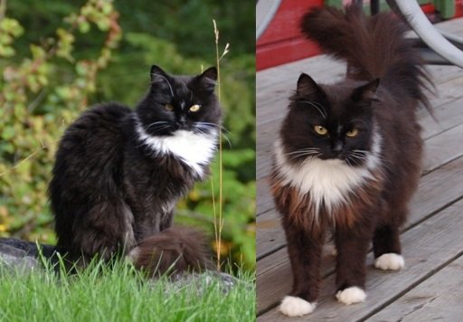 Hun er hovedsaklig svart, med hvit "løvemanke", hvite sokker på alle fire og hvit på magen. På værhårene over øynene er de svart på høyre side og hvit på venstre side. Hun er veldig langhåret i vinterhalvåret, lengre enn på bildet. Hun er ikke så brunaktig i pelsen nå på vinteren som på bildet.. Hun har litt strenge øyne, men er kjempesnill. Hun har chip og tatovering, men er ikke sikker på hvor godt tatoveringen sees da hun er mørk i huden. Men chipen skal merkes i nakken.