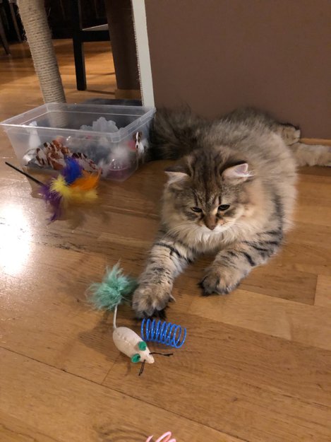 Pusen vår er langåret gråbrun med svarte striper, og hvitt i ansikt og hals.
