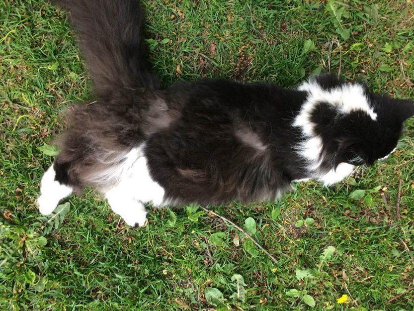 Katten var sort med hvite tegninger på bakbena, hvit krave og hvit i ansikt. Stor hale