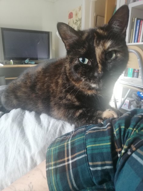 Nesen skilt på midten, halvt svart og halvt lys. Ellers skilpaddemønstret. Liten I størrelse, smidig og ganske verbal.
