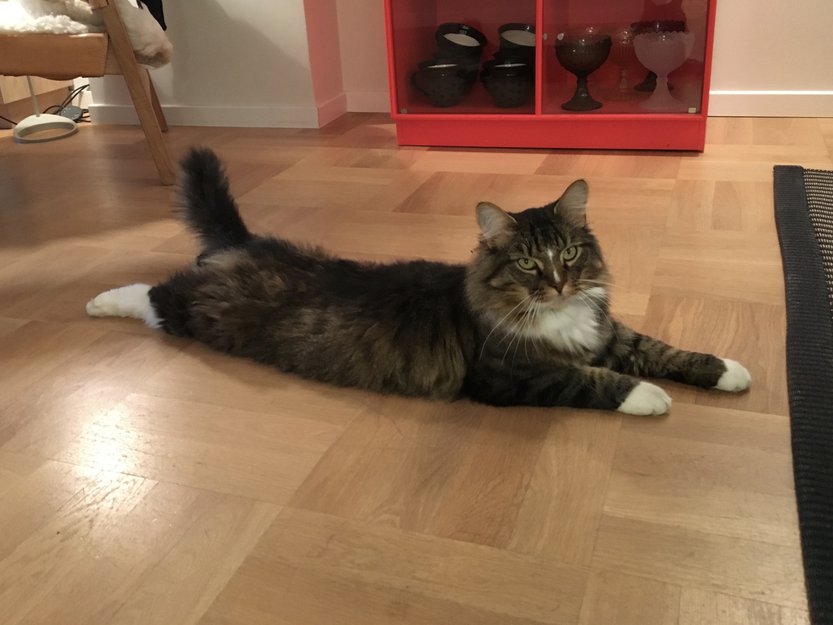 Langhåret, spraglete pels som er mørkest langs ryggen/halen. Hvite poter og hvitt bryst/mage.