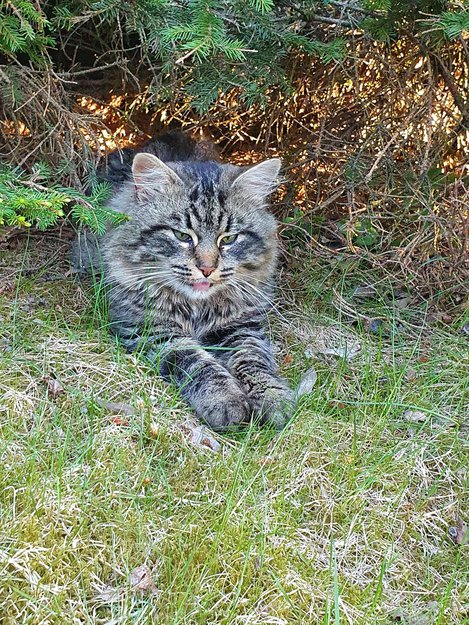 Pusen har oppholdt seg i hagen en stund. Kommer hit ofte. Virker vennlig.