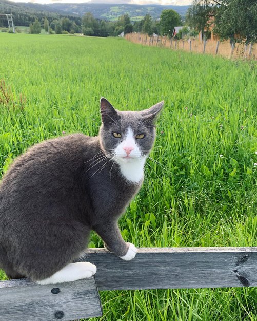 Han er en ganske stor hannkatt, stor nese også har han en grå flekk på den ene bakfoten.
