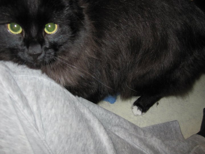 Svart langhåret katt som har litt hvitt på halsen og potene. I godt lys ser man at han er litt grå under magen.