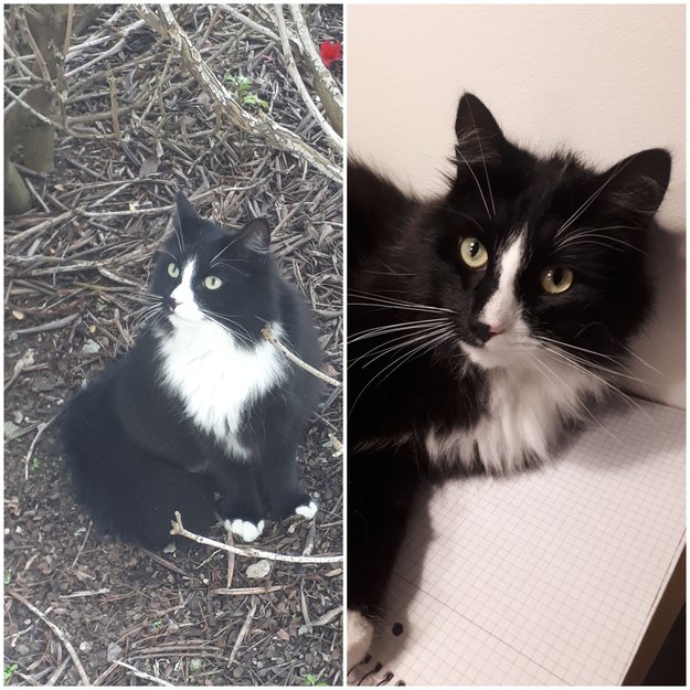 Er svart med litt hvitt i ansiktet, litt hvitt på hals og mage, og hvite poter. Han er chippet og kastrert. Kan være sky rundt nye mennesker.