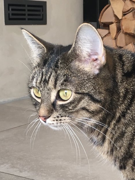 Liten sterilisert hunnkatt - grå/brun stripete med mørke labber - kun en liten hvit flekk på brystet.