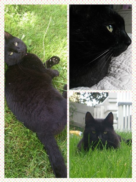 Helt sort med hvite værhår. Operert i venstre bakben 28 april da han kom hjem med alvorlig skade (flenge fra lår til pote) som har skjedd veldig nære hjemmet (begynte ikke å blø før han kom inn). Barbert på bakbenet, "operasjonsarr" fra låret og helt ned på poten. Benet ser tynt ut og derfor lett gjenkjennelig. Tatovert med grønt i venstre øre: ID. Chippet og kastrert.