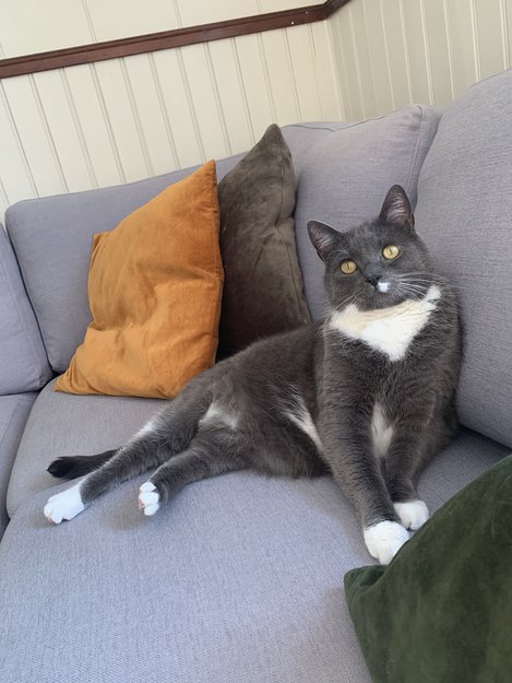 Overvektig grå herrepus med hvit halv bart. Mjauer sjeldent. Har også en hvit krage og er hvit på potene.