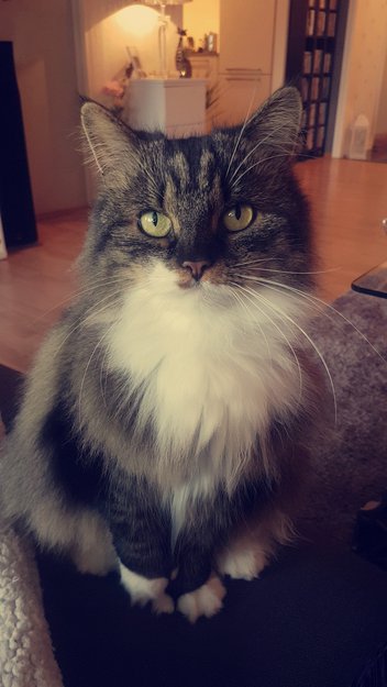 Fia er 9 år, sterilisert, liten og nett. Hun er skipskatt og kjennetegnes ved flere tær. Hun har stort hvitt bryst og hvite poter.