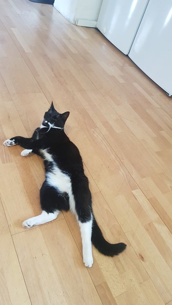 Sort og hvit med hvitt bless og hvite poter og en hvit bart