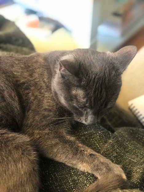 Hun har en lys flekk på brystet, skilpaddefarget ellers. Lyse poter. Hun er veldig halt og sky.