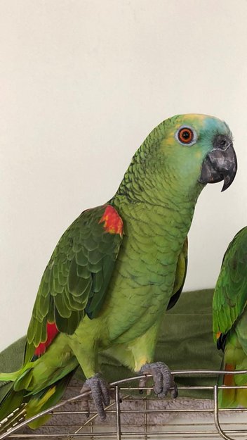 Mellomstor papegøye grønn med noen røde fjær. Noe gult og blått på hodet