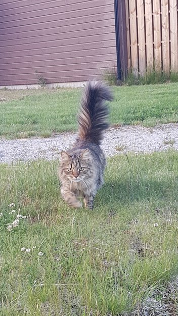 Denne pusen går rundt og mjauer ved Bjørnekroa, Bjørndalsvannet. Den er veldig kosete og se ikke gammel ut. Er rett ved en traffikert vei, men vi har ikke mulighet til å ta den inn, da vi har en annen katt som ikke går så godt sammen med andre katter.