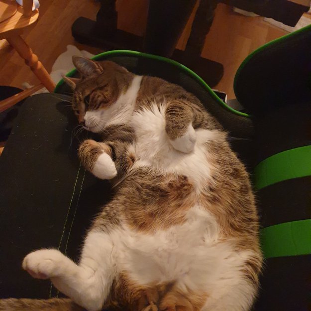 Han er hvit på magen men tricolour beige/brun/svart tiger over ryggen.
