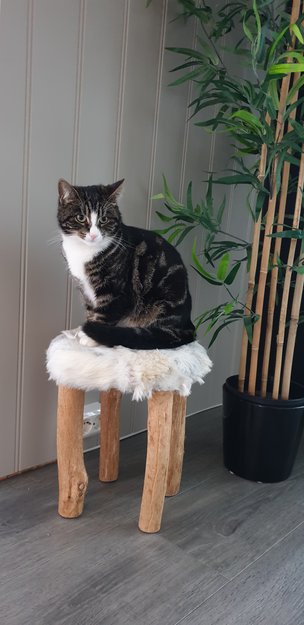 Skipskatt, en "rar" klo på ene poten foran. Veldig glad i barn. Halen ligger over ryggen bestandig.