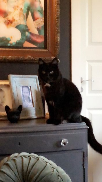 Hun er ganske liten - ser sort ut men er mørkebrun / litt stripete aktig .. ene poten er grå spettet og hun har en hvit flekk på brystet ... lite hår / veldig glatt i er snuten.. hun har halsbånd med bjelle på - og et flått halsbånd