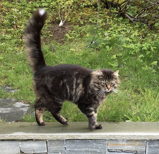 Stripet i ansikt, mørk rygg, fluffy pels og hale, hvit haletipp. Veldig kosete med familien, men redd fremmede. Litt skvetten.
