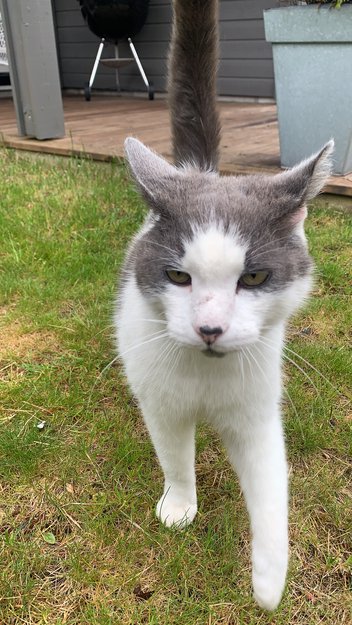 Voksen katt, hvit med grå flekker. Noen klumper i nakken. Veldig kosete og kontaktsøkende. Mjauer masse.