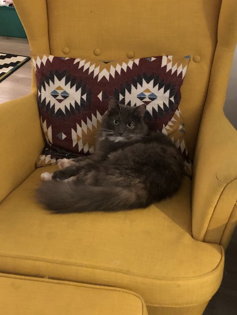 Ho er grå/brun med hvitt bryst og 4 hvite labber med litt rosa skjer i. Ho er ikke så stor, men med en lang bustete hale. Ho kan være sky mot fremmede IG lyr navnet Mille