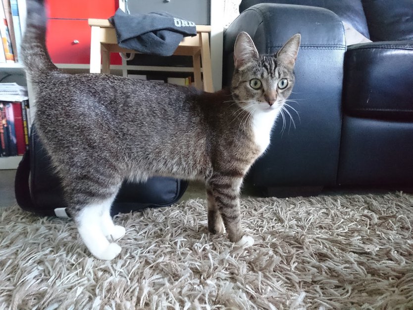 Hun er mørk/brun/grå i pelsen med hvit bryst, mage, labbene bak og tuppen av potene foran. Stripemønster på hale og forlabber, som blir mindre synlige og mer spraglete på ryggen. Svart sirkel rundt kjønnsorganet. Gule øyne og brun på nesen. Hvit rundt munnen. Pleier å svare på "kisa" eller "pus". Ca. 2 år gammel og ikke så veldig stor, litt større/fyldigere enn på bildet. Ganske pysete og sjy, men veldig kosen når hun tør.