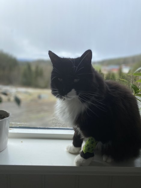 Hun er chippet og kastrert. Har også nylig vært hos dyrlegen og fått tannrens, så venstre frampote er barbert.