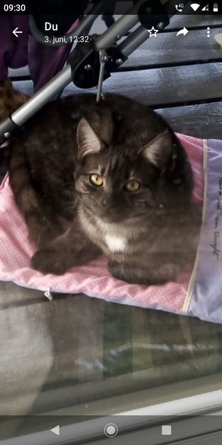 Grå mellom kort pels , hvit under haka. Hun er veldig nysgjerrig men ikke veldig kjælen. Hun kan små bite litt. Heller litt vill en kjælen