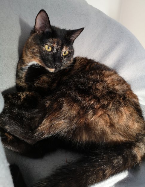 Hun har gule øyne, litt lyse områder rundt begge øynene, ca halve delen av underkjeven er beige og fører ned til et mindre hvitt området på brystet. Ryggen er skillpaddemønstret i svart og rødlig brun. Ene forlabben har et større beige området og det har også ene bakbeinet. Resten av kroppen er en blanding av svart, brunt og lyst litt om hverandre. Halen er helt svart