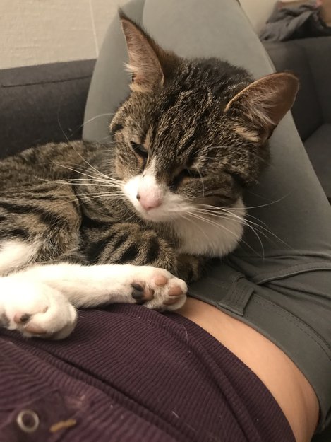 Kosete, men kan være sky/ redd. Korthåret og litt liten i str. Han er grå stripet med litt brunt i seg. Han har hvit underpels og rundt snuten.
