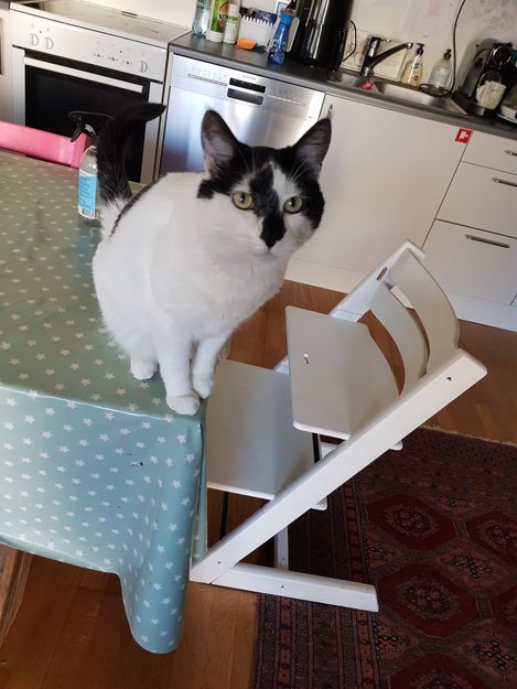 Han er svart og hvit og lyder navnet sitt. Han liker å klatre på ryggen til eier.