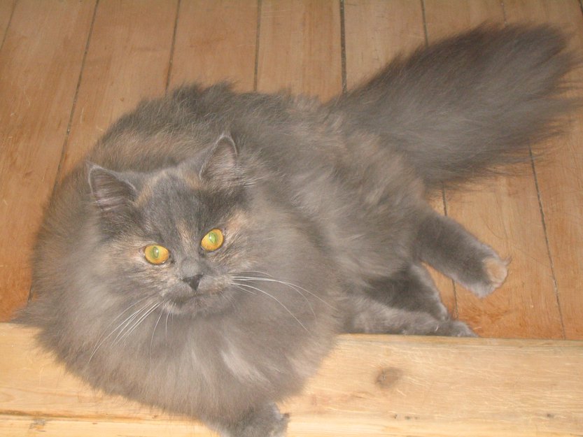 Er Tricolour, men ser mest grå ut. Perser-blanding. Hun er klippet oppe på ryggen og ned mot halen, samt litt under magen.
