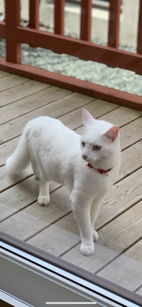 Liten, helt hvit katt. Rødt halsbånd med liten sløyfe på. Halsbåndet løsner hvis det henger seg fast så kan ha mistet det.