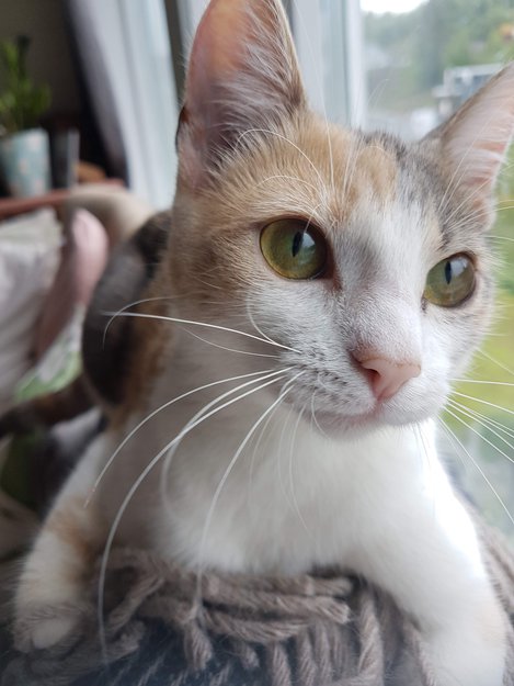 Hun er bare kattunge enda. 9 mnd gammel. Brun svart og hvit. Ansiktet deles i to av svart og hvit farge. Men hele snute partiet er hvitt. Veldig kosete og tillitsfull.