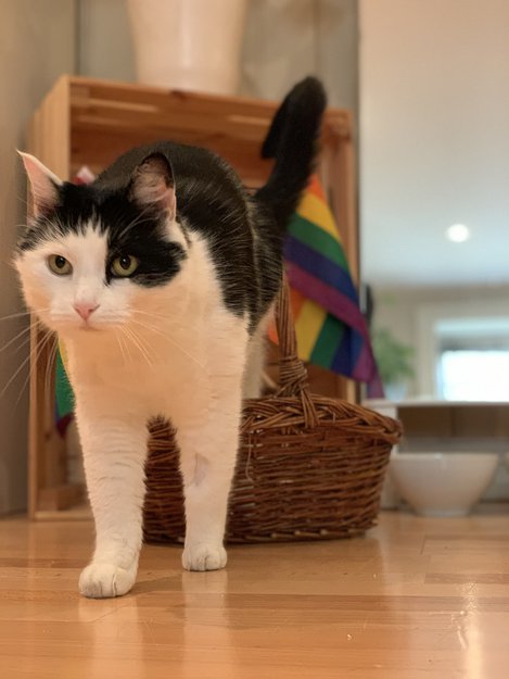 Han er en fosterkatt som har fått opp ett vindu og kommet seg ut. Han er ikke vandt til å være ute i dette området.