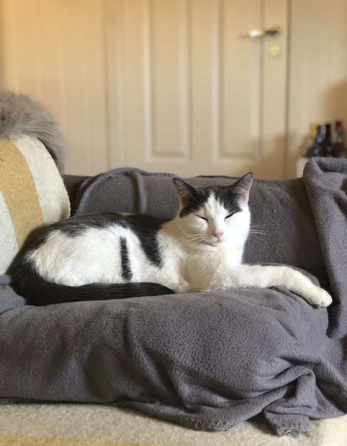 Hun har hvit og grå myk pels, med en del gråe runde flekker på sin venstre side. Hun er en forholdsvis liten frøken, men hun er lang og smidig. En type pus man ikke blir overrasket over å finne på taket.