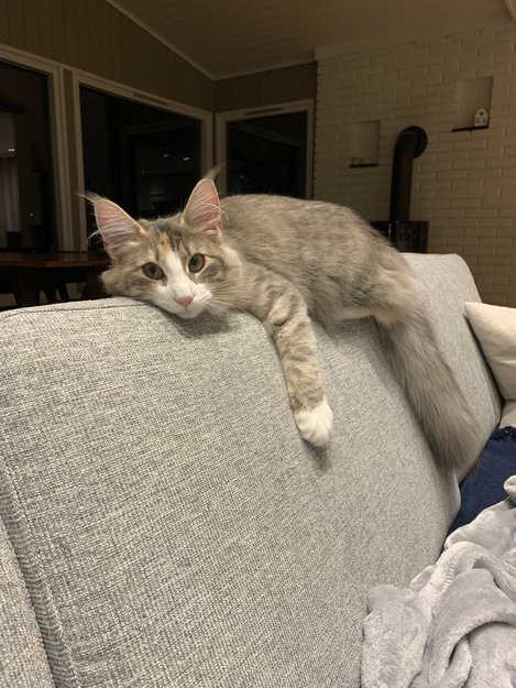 Hun har en liten sår på halsen så hun har ikke halsebånd med nøkkel til kattedører på seg.