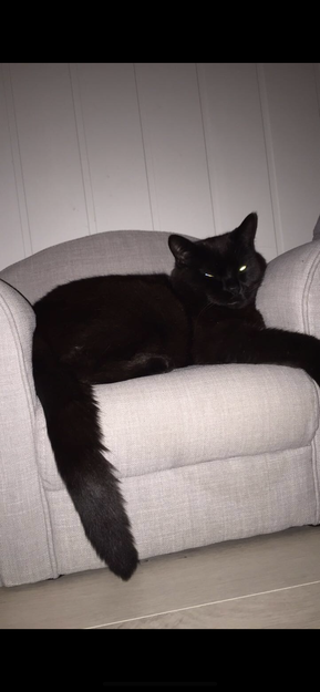 Han er svart. Han har ca 10 hvite hår på brystkassen, og noen hvite værhår.