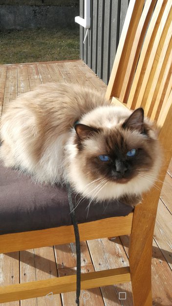 Brunmasket birma, med nydelige blå øyne. Kjennetegn er at ene poten hans er brun, men se de tre andre er hvite.