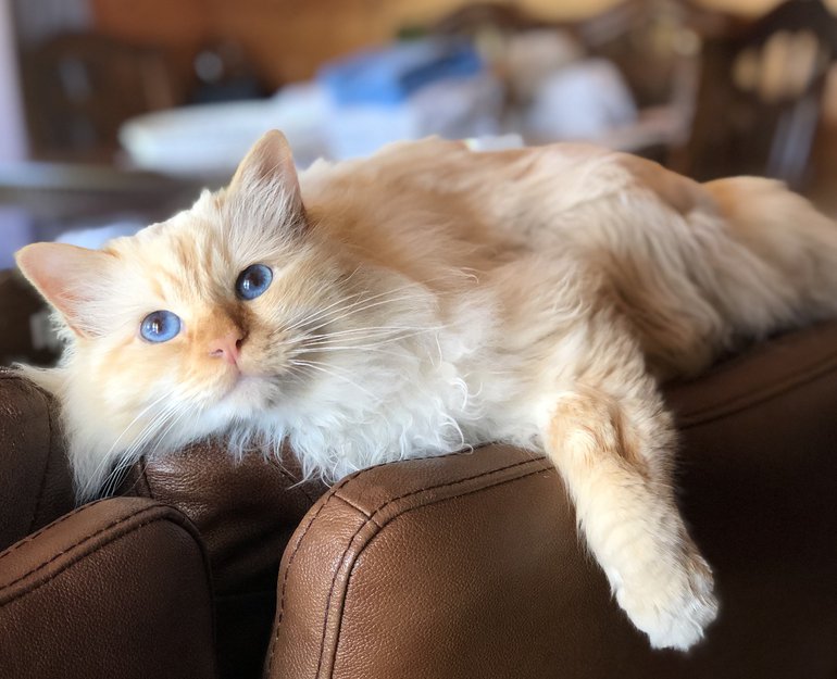 Han er chippet, kastrert og veldig kosete. Han er rød Hellig Birma med knall blå øyne. Han er barbert over ryggen på grunn av floker i pelsen. Denne er antakeligvis ikke veldig markert lengre. Chippen er registrert på Johanne A. Johansen.