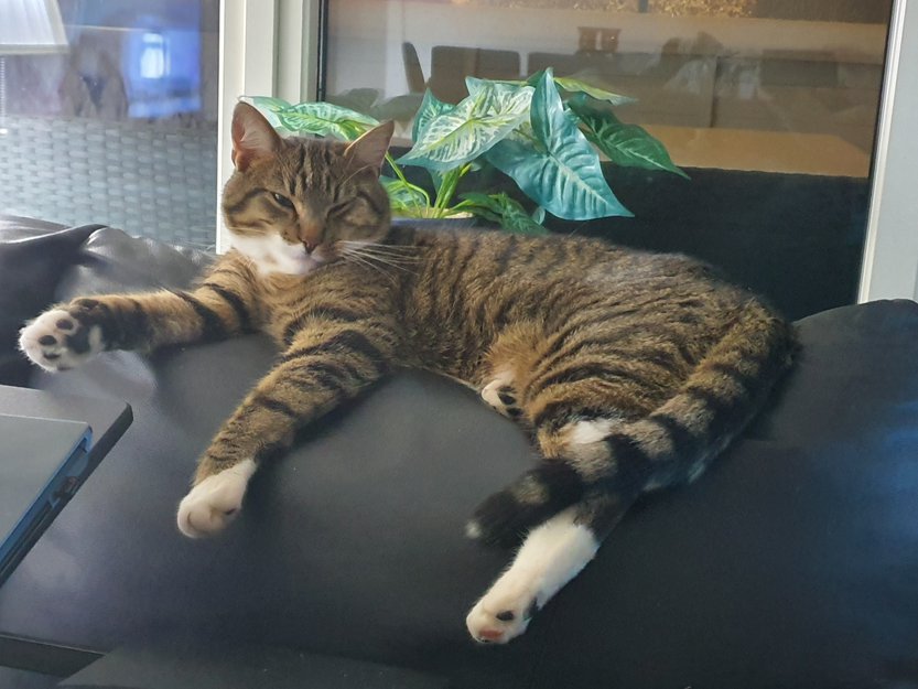 Pelle er brun/ rødlig med sorte striper og kvite poter og bryst. Han er en tillitsfull og snill katt.