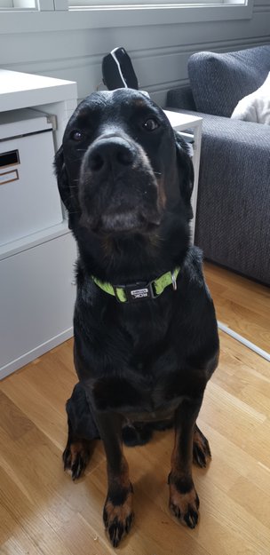 Retrieverblanding, sort/brun. Lysere merker på foter, munn og bak. Har signalgult/grønt halsbånd.