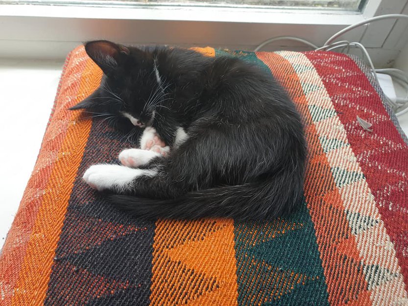 Svart og kvit med kvite spett i pelsen. Kvite potar, kvit flekk på snuten. Søt og kontaktsøkande. Bitteliten kvit flekk ytterst på haletippen, kvitmønstrete under magen. Ellers svart pels. Tynn med litt store øyrer.